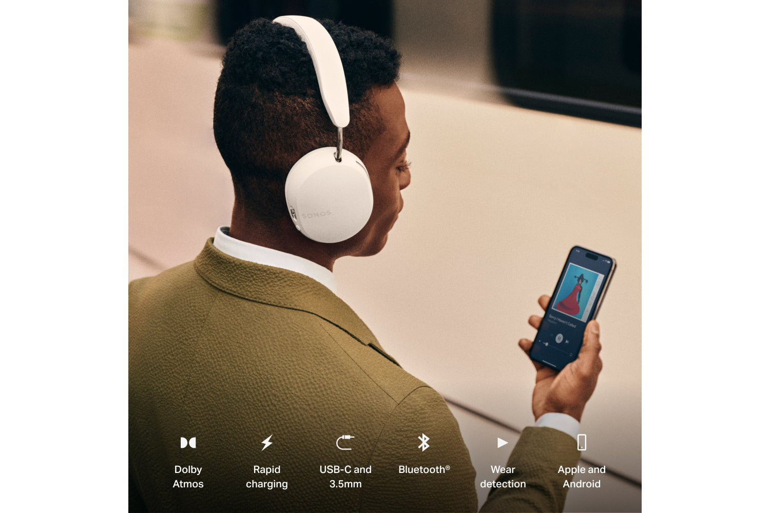 Sonos Ace is ready to go right out of the box. Have two devices paired at any given time, and switch between them without missing a beat.[5] Connect to wired audio sources with the included USB-C and 3.5 mm audio cables.