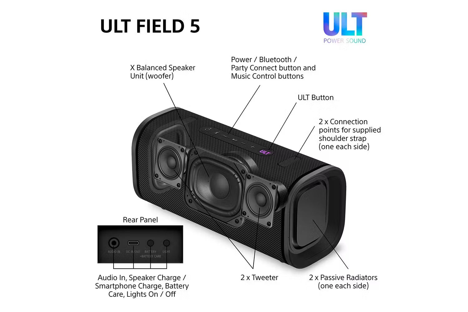 The technology in the ULT FIELD 5 works in harmony for better sound quality. The X-Balanced Speaker Unit delivers deep, punchy bass, and clear vocals even at high volumes. A high-efficiency tweeter provides crisp and spacious sound for high-frequencies. And the passive radiators are optimised for impressive bass extension and distortion-free sound. Put it all together and you get a great sound worth sharing with your friends.