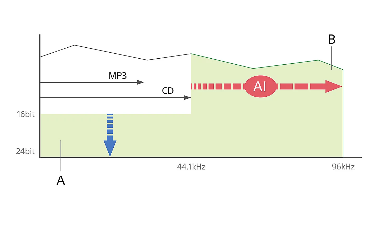 Using Edge-AI (Artificial Intelligence), DSEE Extreme[4] upscales compressed digital music files in real-time, including those from popular streaming services. It dynamically recognises each song's instrumentation, musical genre and individual elements, and restores high-range sound lost in compression.