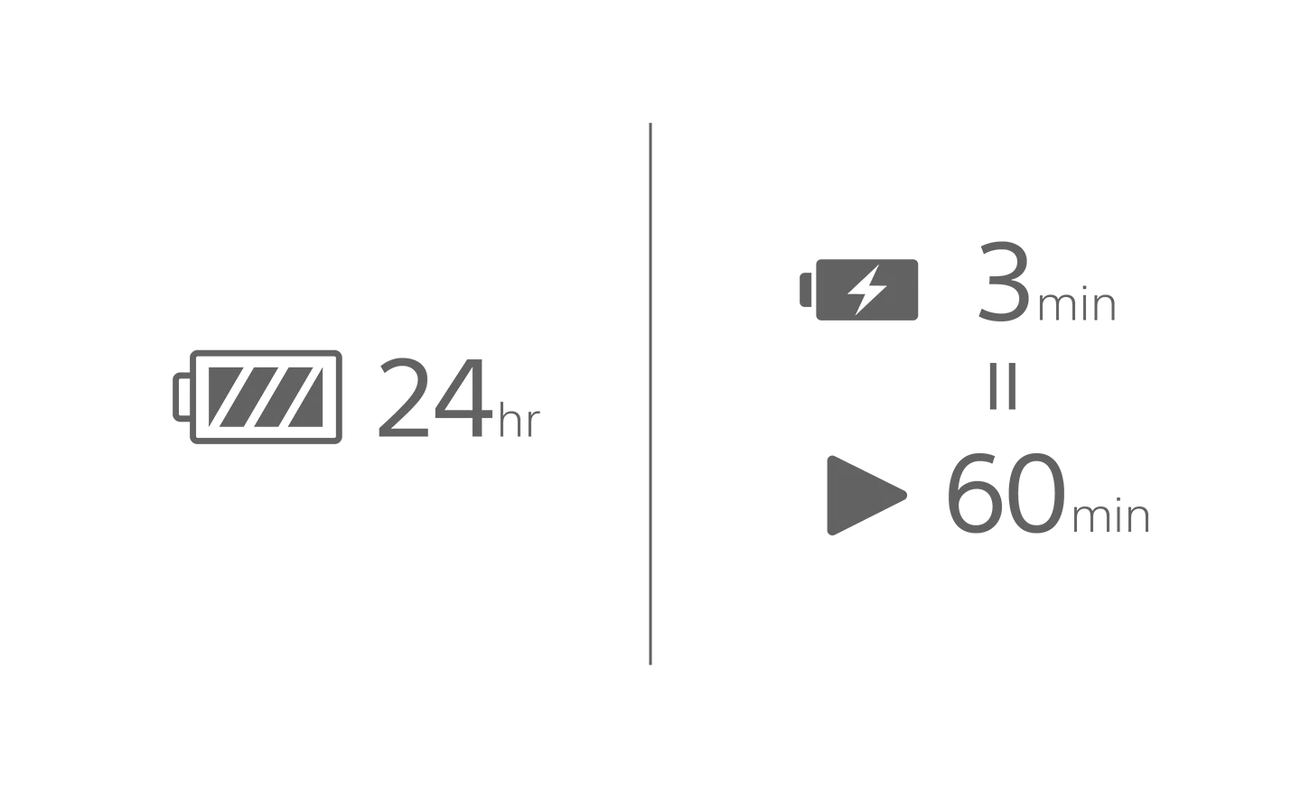 You can enjoy up to 8 hours of charge on your headphones and store another 16 hours in the case for a full 24 hours[28] of listening every time you leave the house. And, for your convenience, a 3-minute quick charge will give you up to 60 minutes of play. The Sony | Sound Connect app will notify you when your charging case drops below 30%.