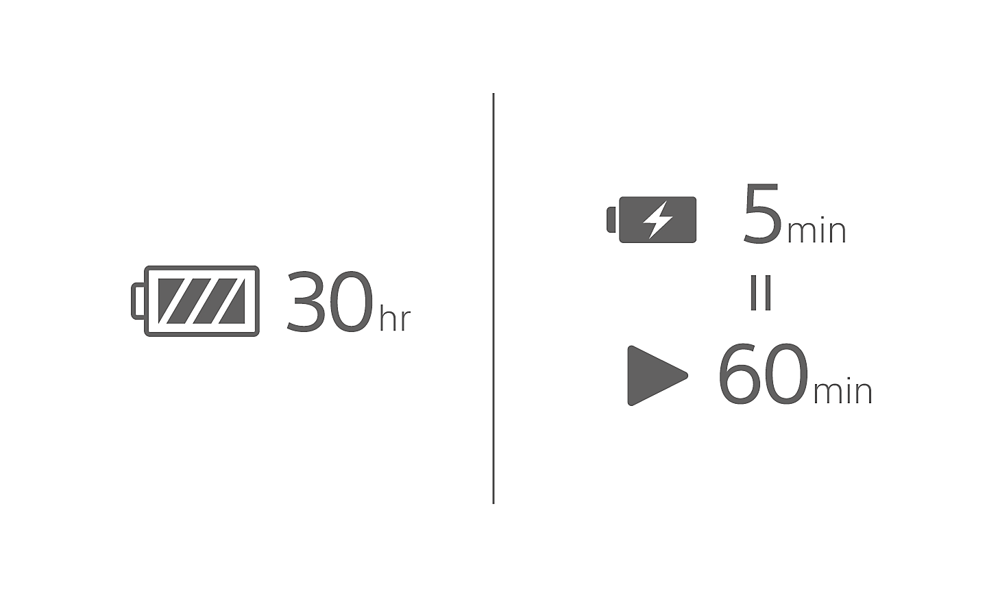 Designed for all-day comfort and use. The longer battery life means you can enjoy up to 8.5 hours on your earbuds and another 21.5 hours in the case. That's a full 30 hours of listening when fully charged[1][2]. And with 5-minute quick charging, you can top up in a hurry for an extra hour.