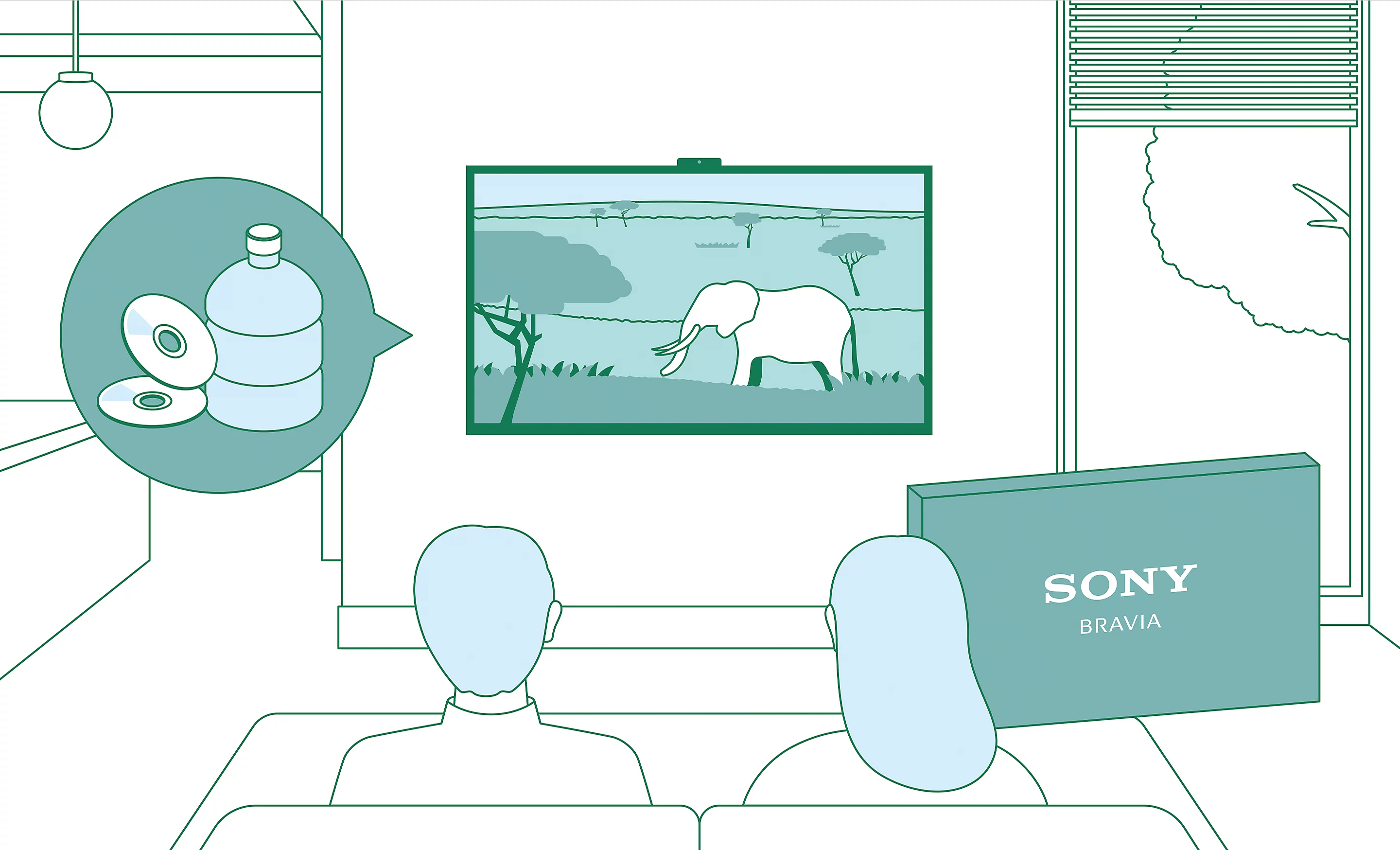 Sony-developed SORPLAS recycled plastics are used in Sony TVs to minimise virgin plastics by approximately 60%, maintain durability and achieve the beautiful high gloss black finish synonymous with BRAVIA. What's more, Sony new packaging uses around 48% less plastic volume.[5,6,7,8]