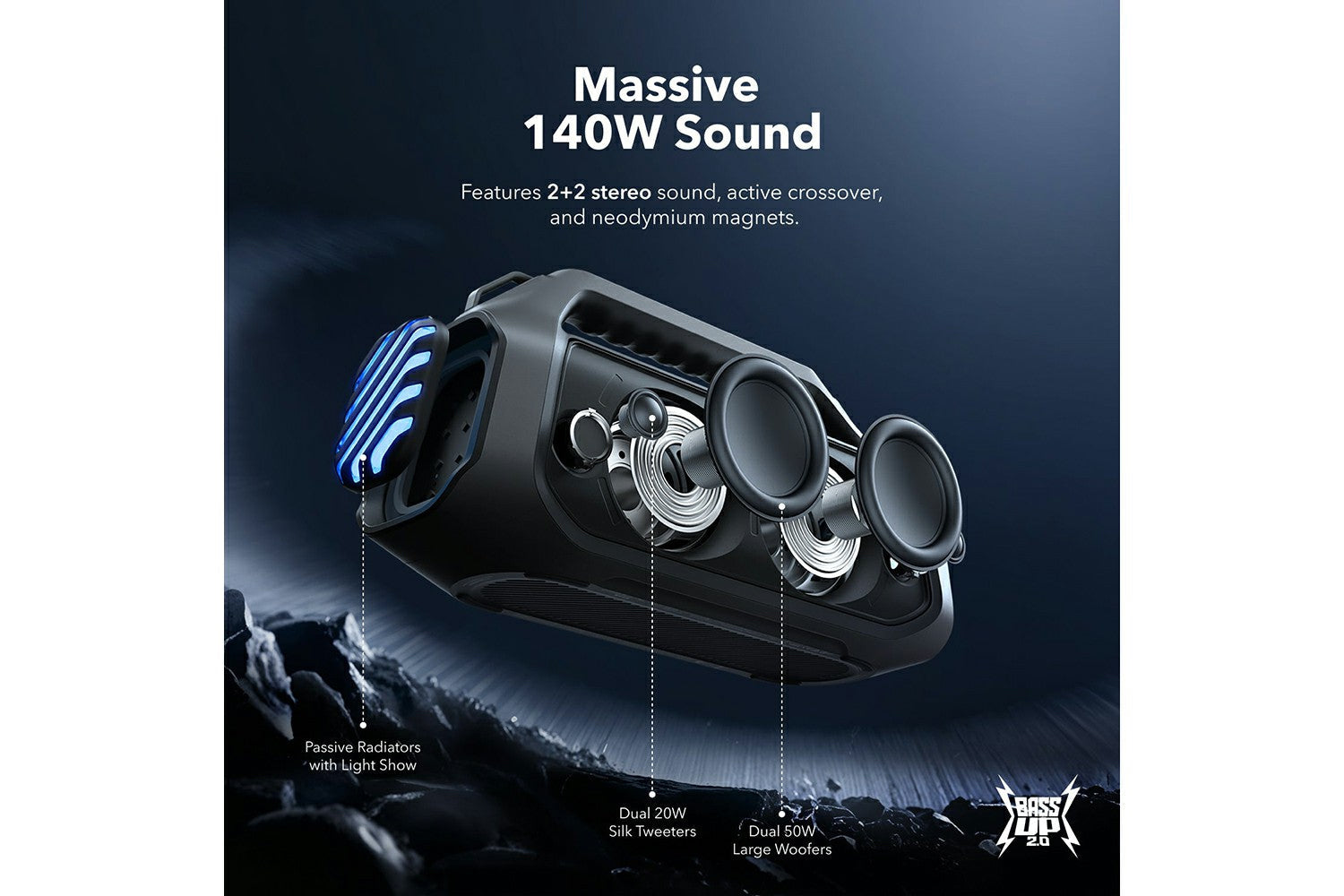 Electrify your party with twin large passive radiators that boost low frequencies and expand the soundstage.