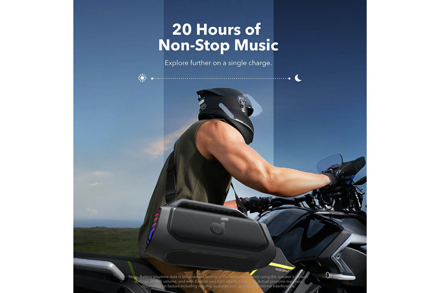 Battery playtime data is obtained via testing in the Anker laboratory using the speaker's default settings, at 50% volume, and with BassUp and light effects turned off. Actual playtime may vary depending on factors including volume, audio source, and environmental interference.