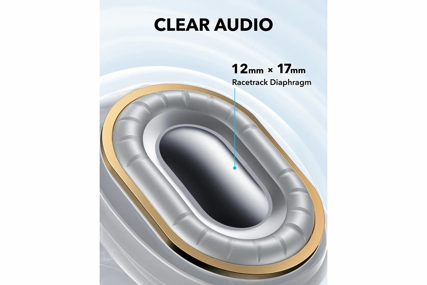 12mm x 17mm racetrack dynamic drivers with titanium-coated diaphragms deliver clear, impactful sound despite open-ear listening and standout clarity for podcasts and audiobooks.