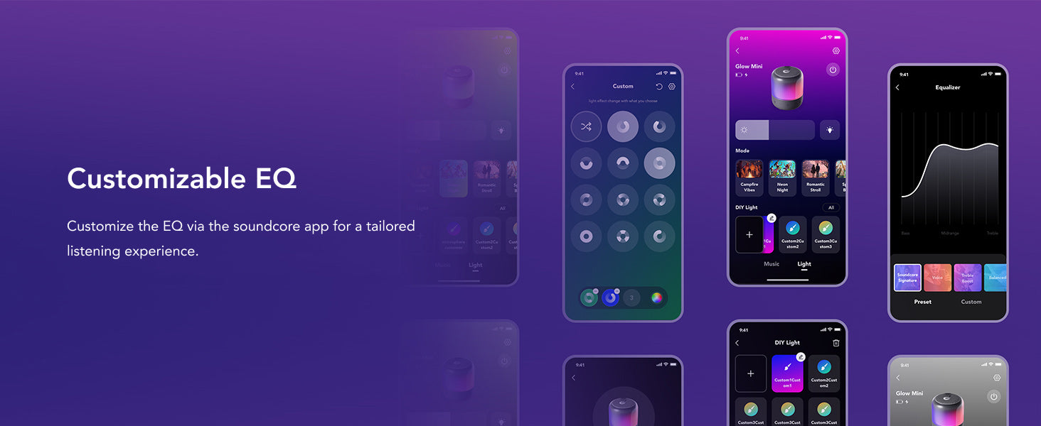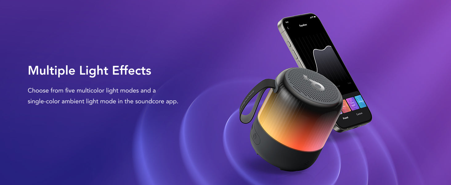 Choose from five multicolor light modes and a single-color ambient light mode in the soundcore app.