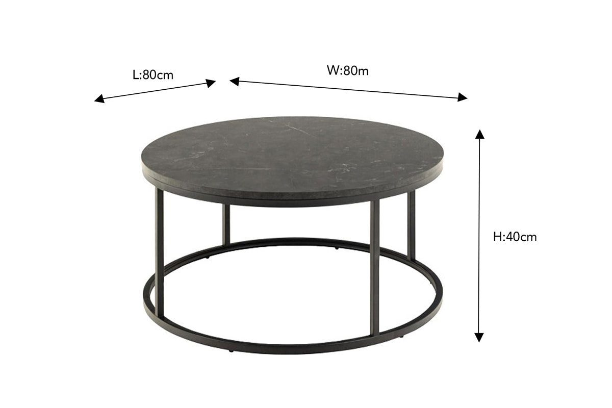 The Spiro coffee table is crafted from wood with a black marble look that radiates luxury giving a refined feel to any interior. It rests upon sleek black metal legs that complement this piece further elevating its look. Offering the perfect place to rest your beverages, snacks, and TV accessories, this table will make an excellent addition to your home.