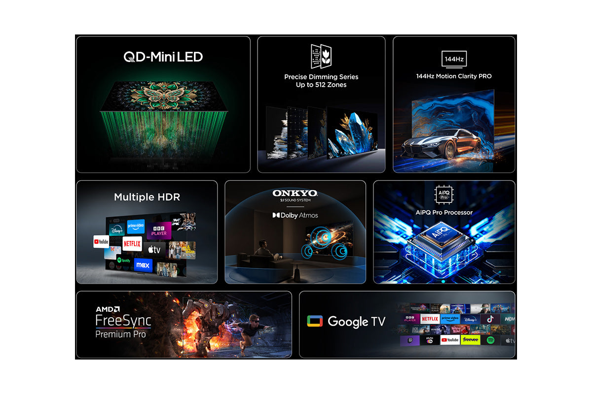 TCL C6K combines the power of ONKYO's 2.1 CH Hi-Fi. lmmerse yourself in the captivating stereo sound and thunderous bass, capturing every detall as if you were at a live band performance. Elevate your home theater experience with unparalleled audio excellence.