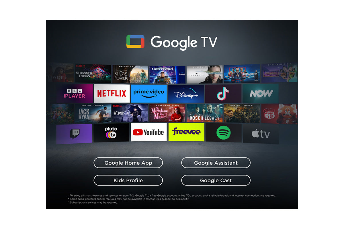 *To enjoy all smart features and services on your TCL Google TV, a free Google account, a free TCL account, and a reliable broadband internet connection, are required.