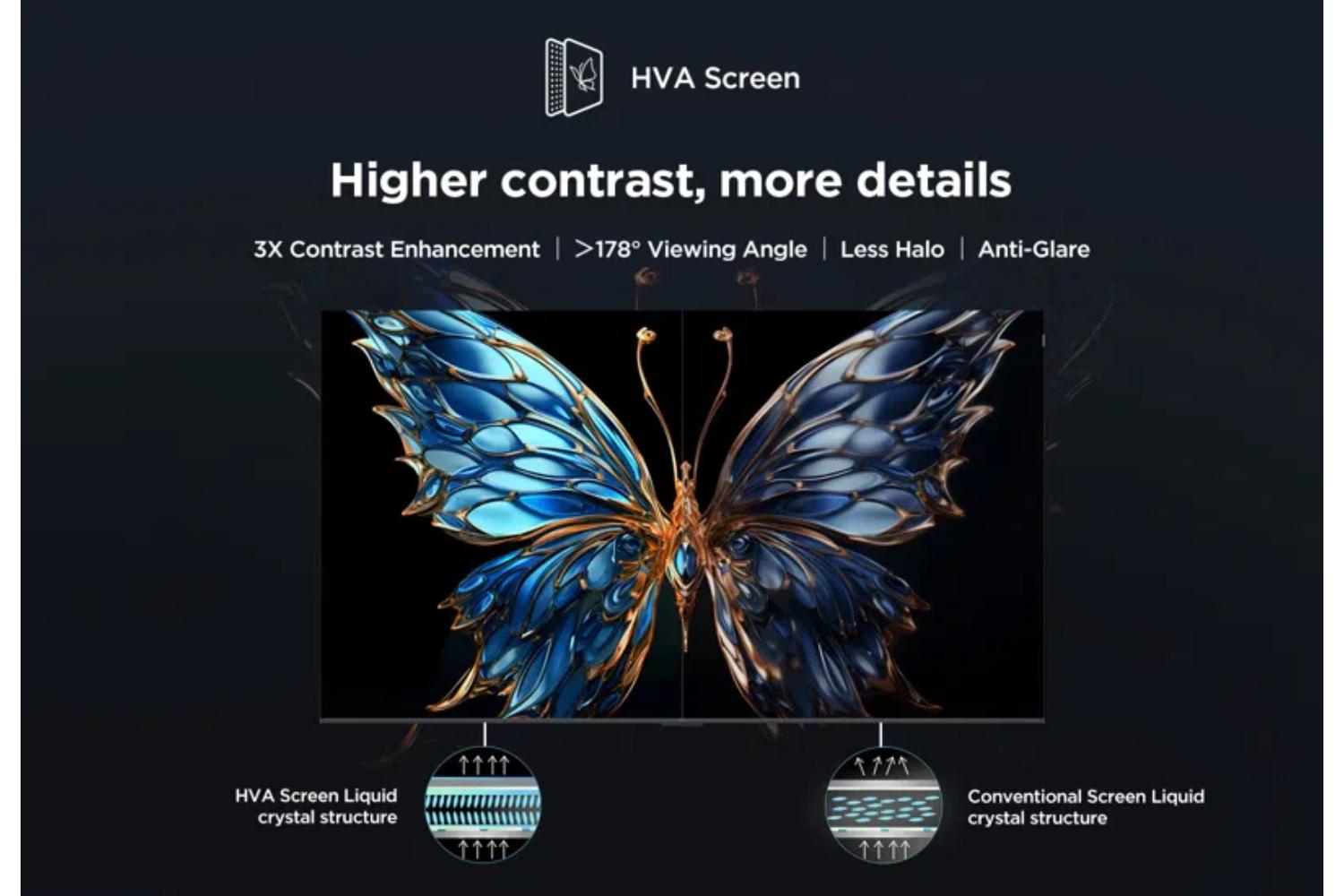 With innovative technology, TCL self-developed HVA Screen effectively emphasizes stronger and more accurate contrast while removing image halo and ambient light interference, presenting a clearer and more detailed stunning picture quality.