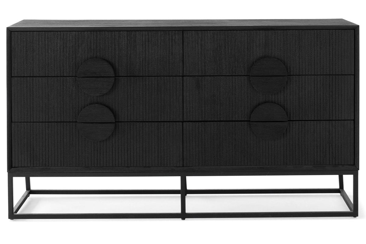 Whether you're looking to enhance your contemporary space or add a modern and unique feature to your existing interior décor, the Teca dresser is the perfect piece! Made from white ceder wood with a matt black finish this dresser is incredibly durable and stylish. It includes six drawers perfect for storing all your clothing essentials in an easy to reach place, while the tabletop provides ample space for a table lamp, some books or other decorative pieces. This piece features a linear design with circular handles and is complete with the complimenting black metal legs that really tie this table together.