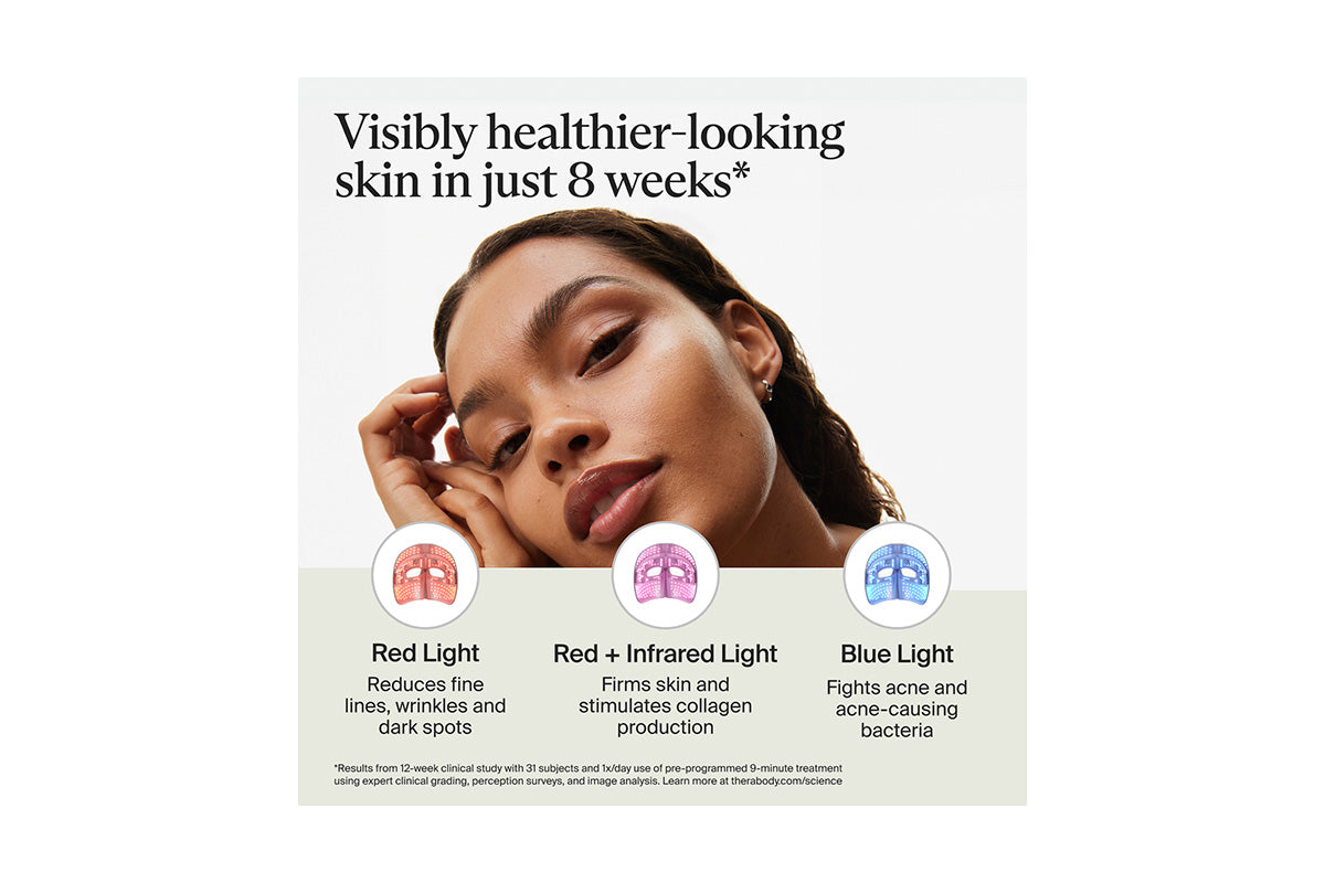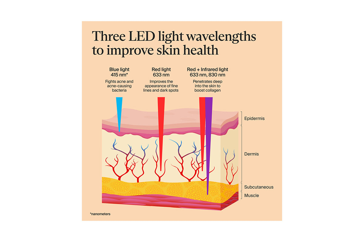 Red and Infrared LED light therapy boosts your skin's natural collagen production to firm the skin and reduce deep wrinkles for a more youthful complexion.