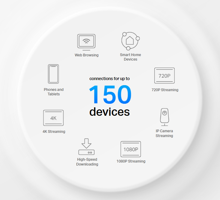 The latest 1024-QAM and higher symbol rate combines to boost speeds up to 1.8 Gbps—ideal for bandwidth-intensive tasks like cloud gaming and 4K UHD video. Families will enjoy immersive live-streaming with flawless video and clear audio without buffering.△†