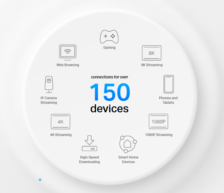 △Use of WiFi 6 and other features including OFDMA, MU-MIMO, 1024-QAM, HE160 and BSS Color require clients to also support the corresponding features. The 160 MHz bandwidth may be unavailable in the 5 GHz band in some regions/countries due to regulatory restrictions.