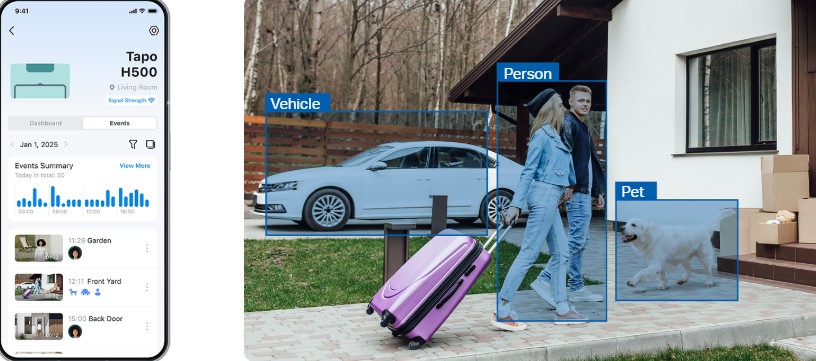 Connect non-AI cameras to Tapo H500 to equip them with intelligent features like recognizing people, vehicles, and pets, delivering smarter security.