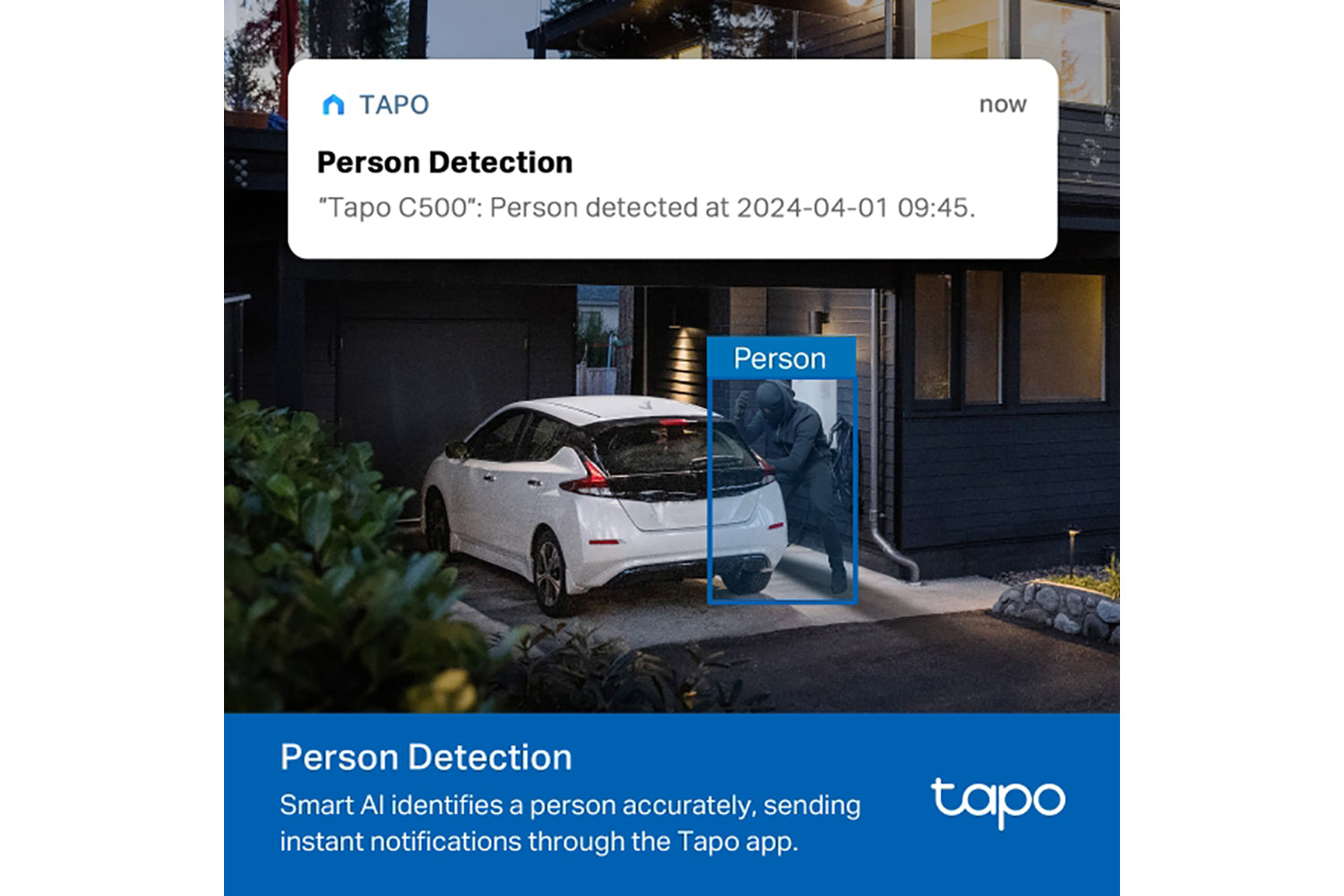 Smart AI identifies a person accurately, reducing false alarm and sending real-time notifications through the Tapo app.