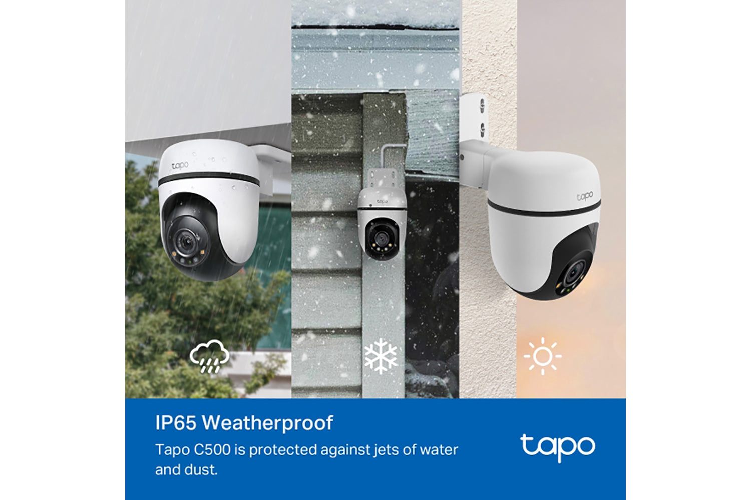 Tapo C500 is protected against jets of water and dust with IP65 weatherproof rating. It works well in rain, snow, dust and heat.