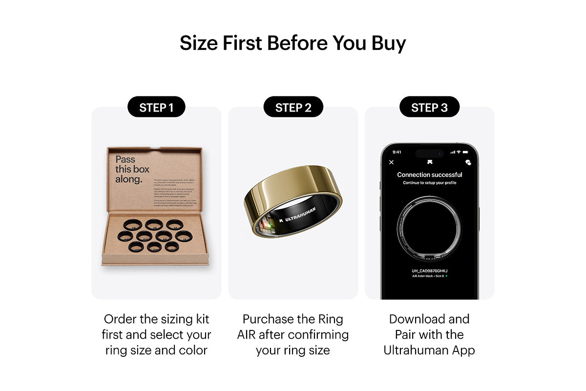 Ultrahuman Ring sizes differ from standard ring sizes. Purchase the Ultrahuman Sizing Kit first, which includes a ring sizer, to accurately determine your size. The Ring AIR is available in 10 sizes (5-14), ensuring a comfortable, secure fit. Using the sizing kit helps you avoid returns and exchanges, ensuring you select the right size before purchasing.