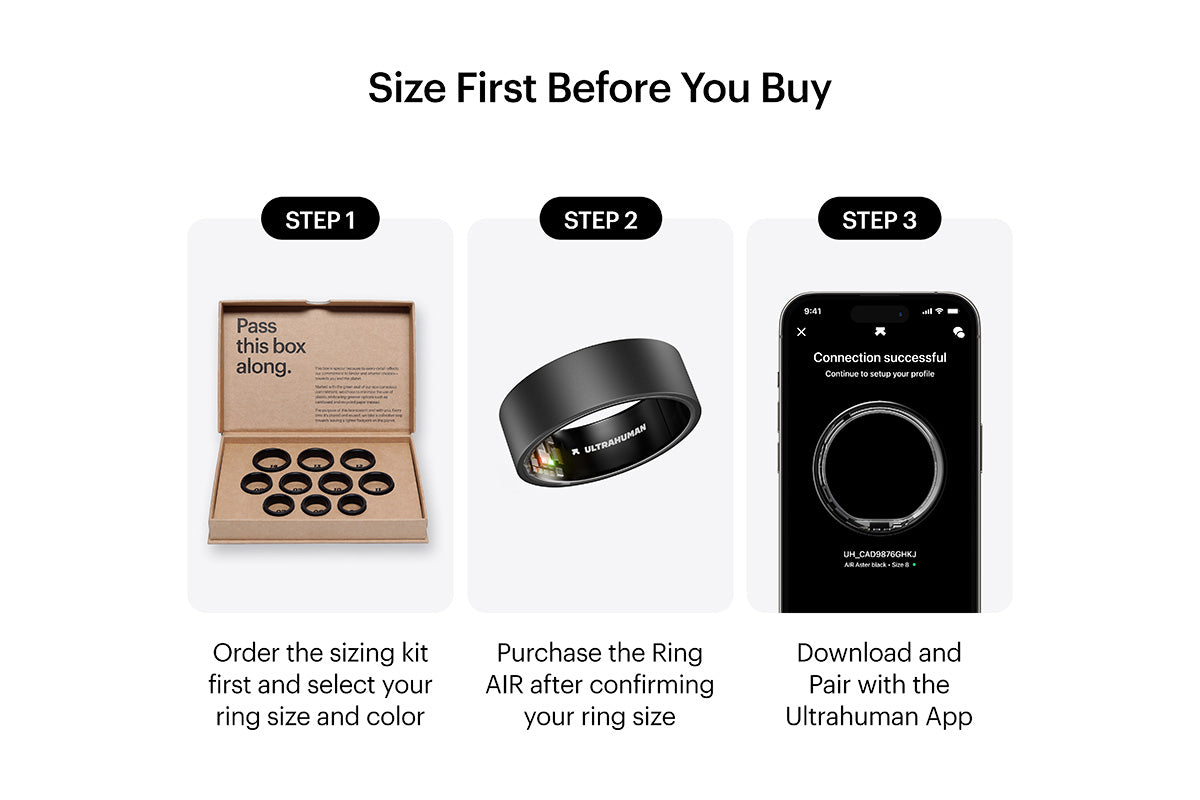 Ultrahuman Ring sizes differ from standard ring sizes. Purchase the Ultrahuman Sizing Kit first, which includes a ring sizer, to accurately determine your size. The Ring AIR is available in 10 sizes (5-14), ensuring a comfortable, secure fit. Using the sizing kit helps you avoid returns and exchanges, ensuring you select the right size before purchasing.