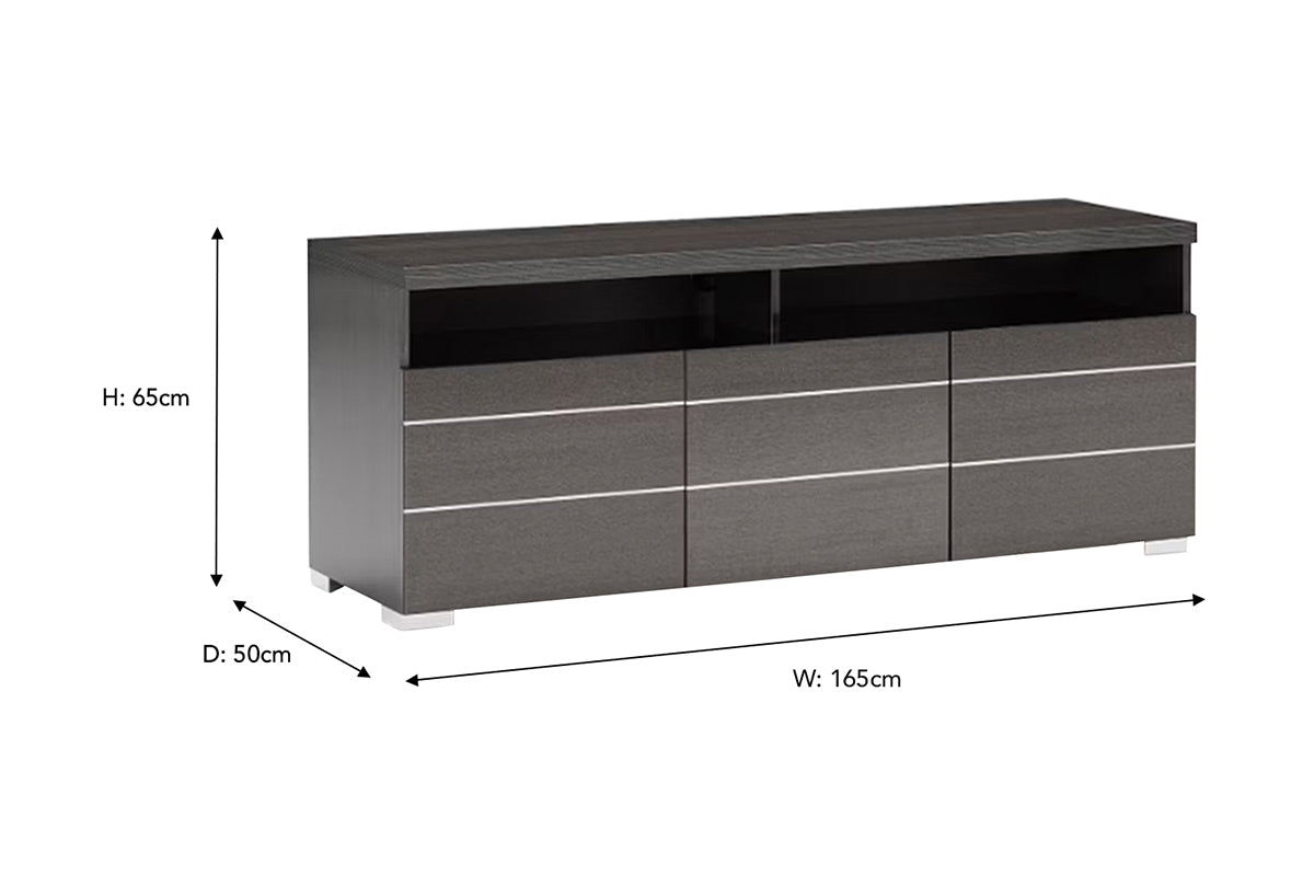 Beautifully built to last with a wood frame and a high gloss finish. Three large cupboards provide optimal storage space while additional space is also provided beneath the unit top. You can discreetly hide your cables at the back of the unit with cleverly placed cable holes. The pairing of metal legs and a linear metal feature on the face makes this TV unit a trend setter. Simply sit back with your favourite show and take it all in.