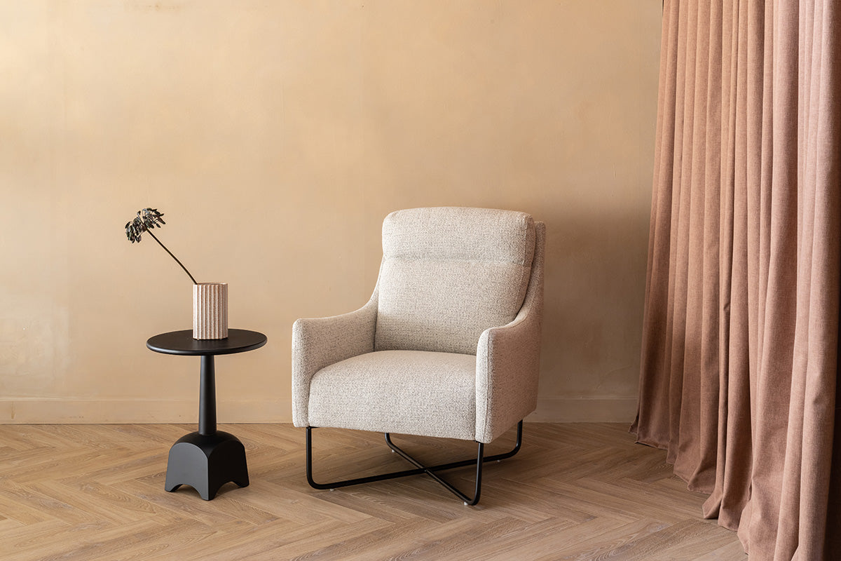 Fabric upholstery and foam and fibre padding make the Wendy a long lasting piece of furniture with just the right balance of comfort, support, and shape that won’t sag over time – not to mention style. Unique crossed iron feet add contemporary elegance to the design, along with slimline arms that curve upwards at the tip.