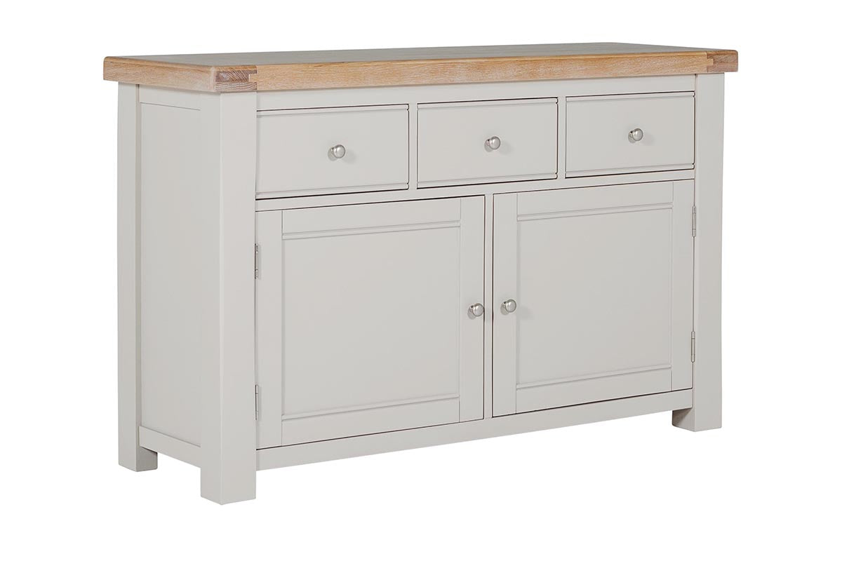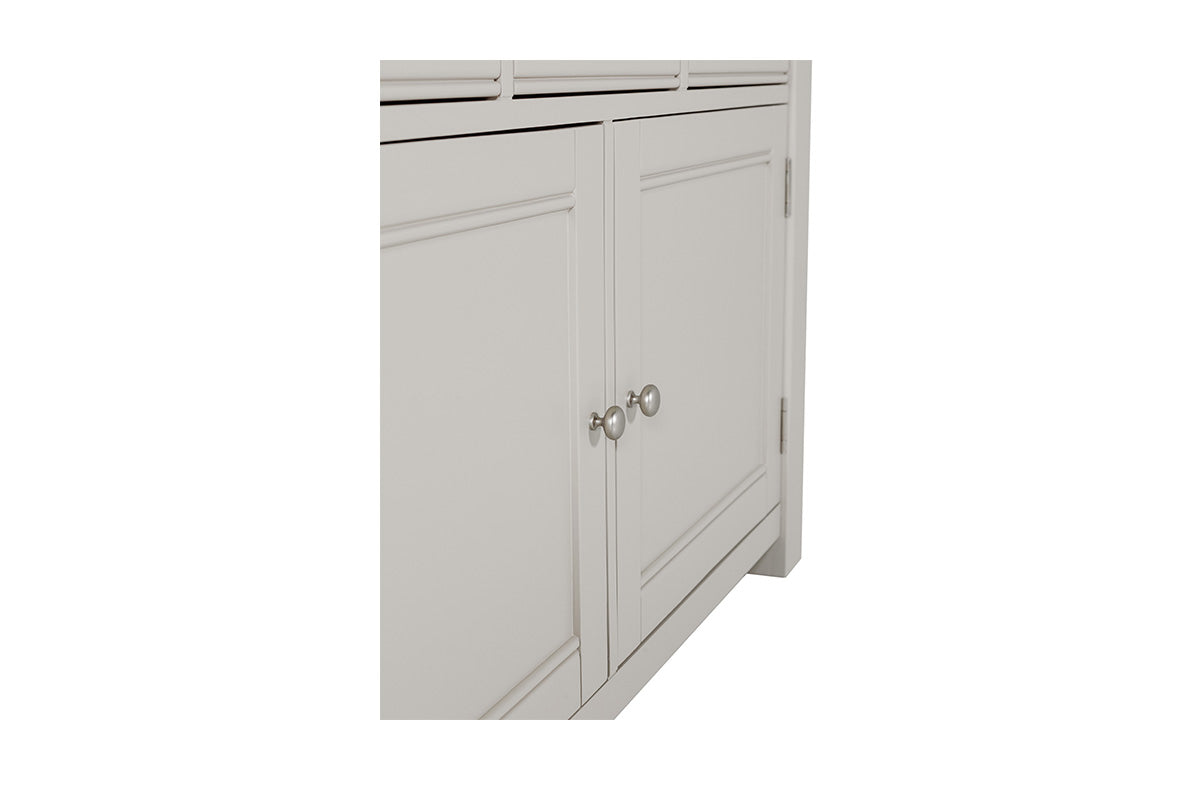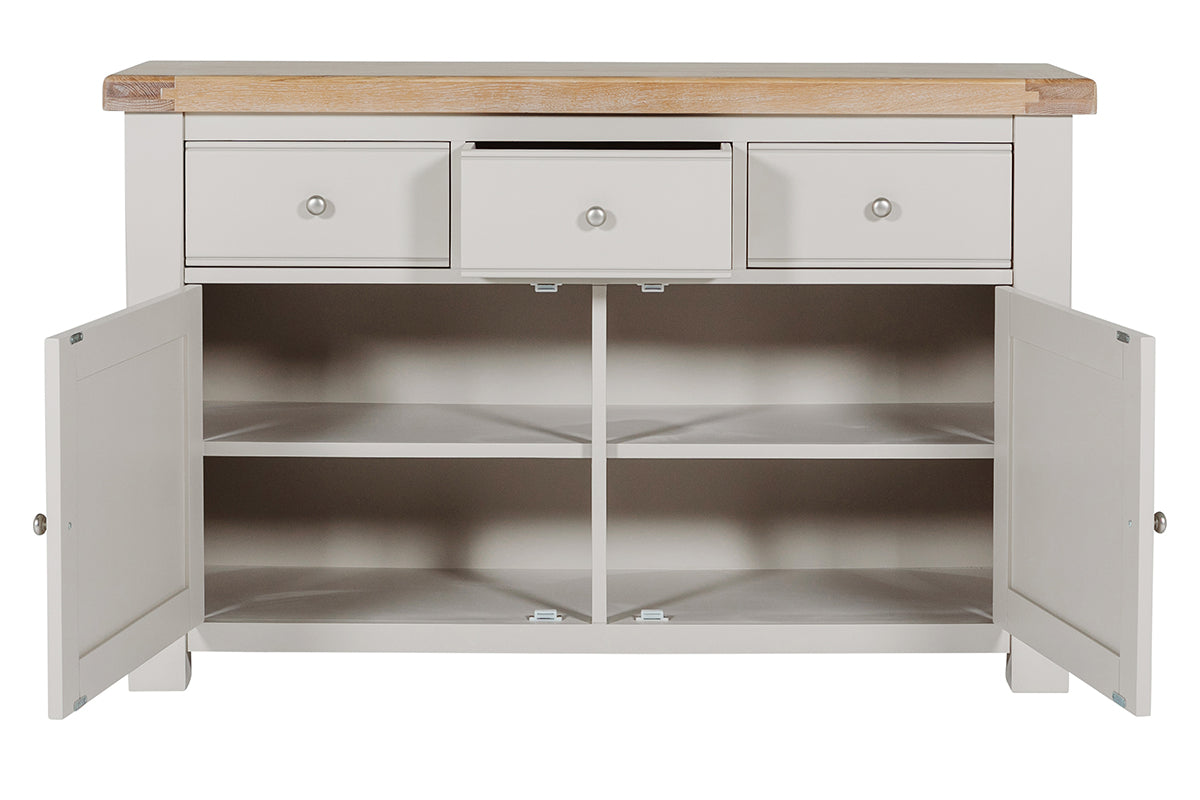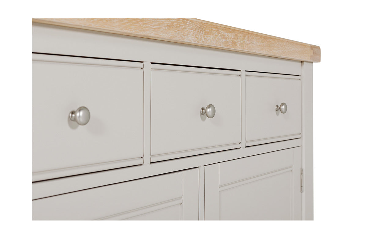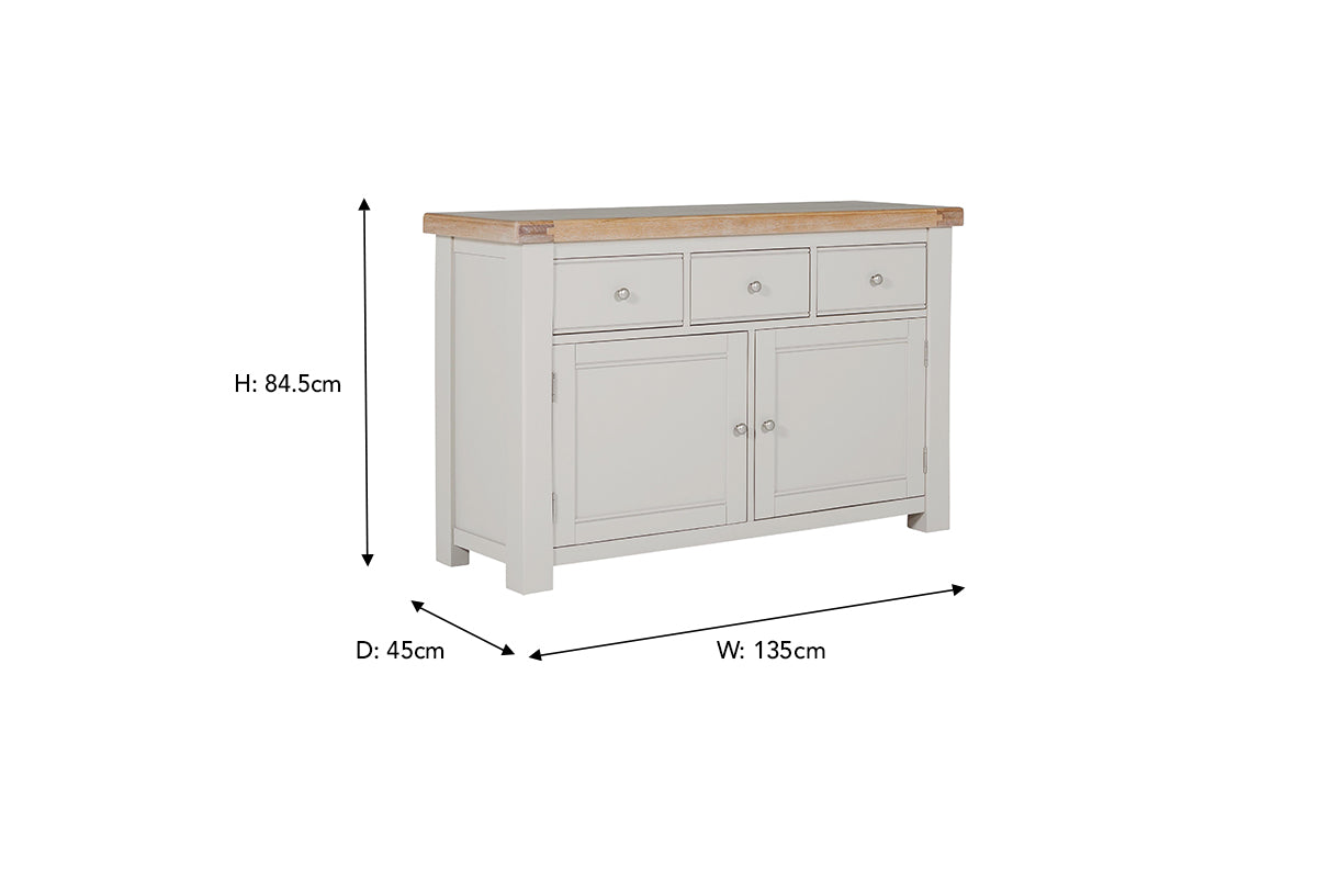 Keep your home clutter-free with the classic Winnie large sideboard, the perfect addition to any kitchen or dining room. With three drawers and two spacious cupboards you have ample space to store all your dining essentials. The surface top can be used as an area for prepping, or as a decorative space for flowers, vases, or other ornamental items.